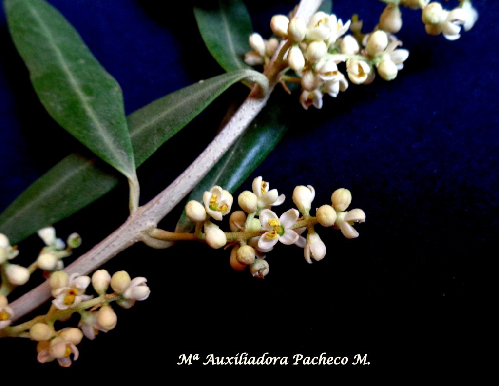 Hace poco una joven amiga me enseñó la foto que hizo el año pasado de las flores del olivo. Se había llevado un ramito de un jardín y lo había fotografiado en casa con el móvil. Había acertado con la luz y el enfoque, y sacó toda la belleza de esas pequeñas maravillas. Pero las había puesto sobre un posavasos con un bonito dibujo, con lo que quedaban un tanto desdibujadas y no resaltaban todo lo debido. Elogié su foto y le recomendé que cuando volvieran a florecer los olivos, hiciera una foto con otro fondo. También le pregunté la fecha de la foto, para hacer mi propia foto cuando florecieran los olivos. Hace unos días cogí una ramita con flores, y la fotografié con un fondo negro. Mi ramita tiene menos flores que la suya, pero resalta mucho más. El secreto fue elegir un fondo liso y oscuro, que le diera todo el protagonismo.