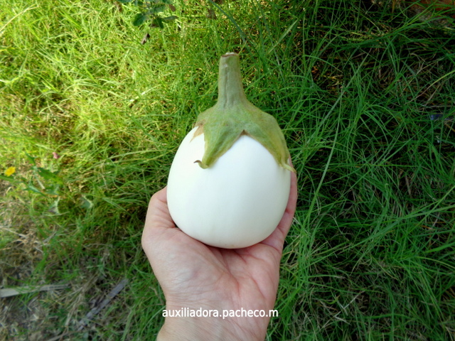 ¿Una planta que da huevos? No, es una berenjena blanca en el huerto de La Noria, Málaga.